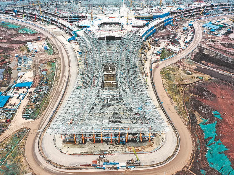 Acélszerkezet A repülőtéri terminálok nagy spanyol térbeli rácsokat vagy retikulált héjakat fogadnak el, hogy oszlopmentes nyitott tereket érjenek el, kielégítsék a nagy forgalmú utasok áramlásának és a rugalmas funkcionális terület elrendezésének igényeit. Könnyű acélkeretek üvegfüggönyfalakkal vagy ETFE membránokkal kombinálva maximalizálják a természetes megvilágítást és csökkentik az energiafogyasztást. Az előregyártott alkatrészeket gyárakban állítják elő és gyorsan összeszerelik a helyszínen, jelentősen lerövidítve az építési időszakot és minimalizálva a repülőtéri műveletekre gyakorolt ​​hatást. Az acél nagy szilárdságú és szeizmikus-rezisztens tulajdonságai ellenállnak az erős szélnek és a földrengéseknek. Az ívelt formák modern és technológiai hangulatot adnak az épületeknek, és a BIM technológiát használják a csővezeték integrációjának, valamint az intelligens üzemeltetési és karbantartási rendszerek optimalizálására.